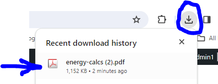 Retrieve your energy calcs at the download icon (top right hand corner of your browser screen).